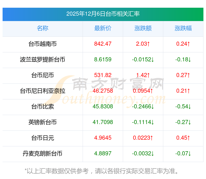 根據(jù)2025年12月6日匯率,臺幣兌換加拿大幣匯率最新0.044160,今開0.0442,昨收0.0442,最高0.0447,最低0.0442。