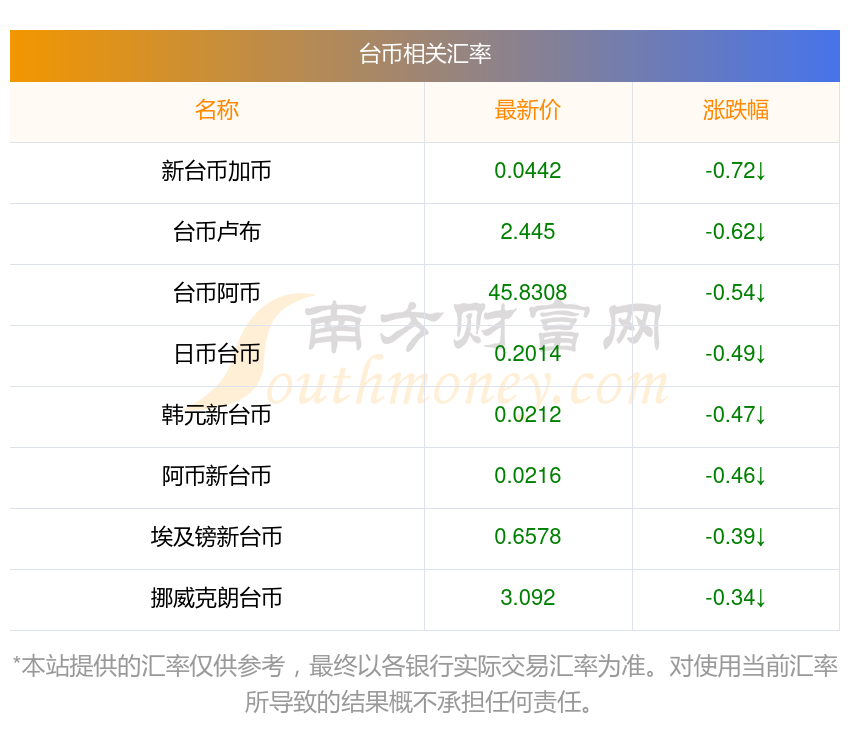 南方財富網(wǎng)為您提供臺幣對泰銖匯率最新價格詳情。