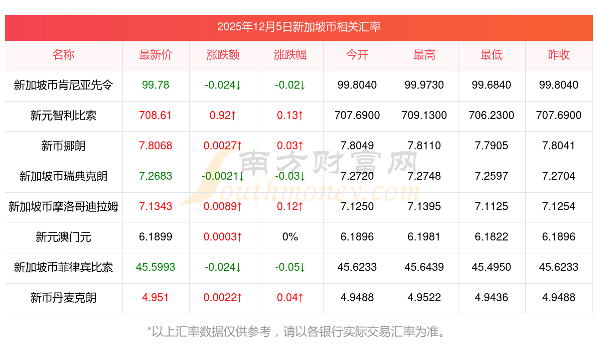 2025年12月5日新加坡幣相關(guān)匯率查詢