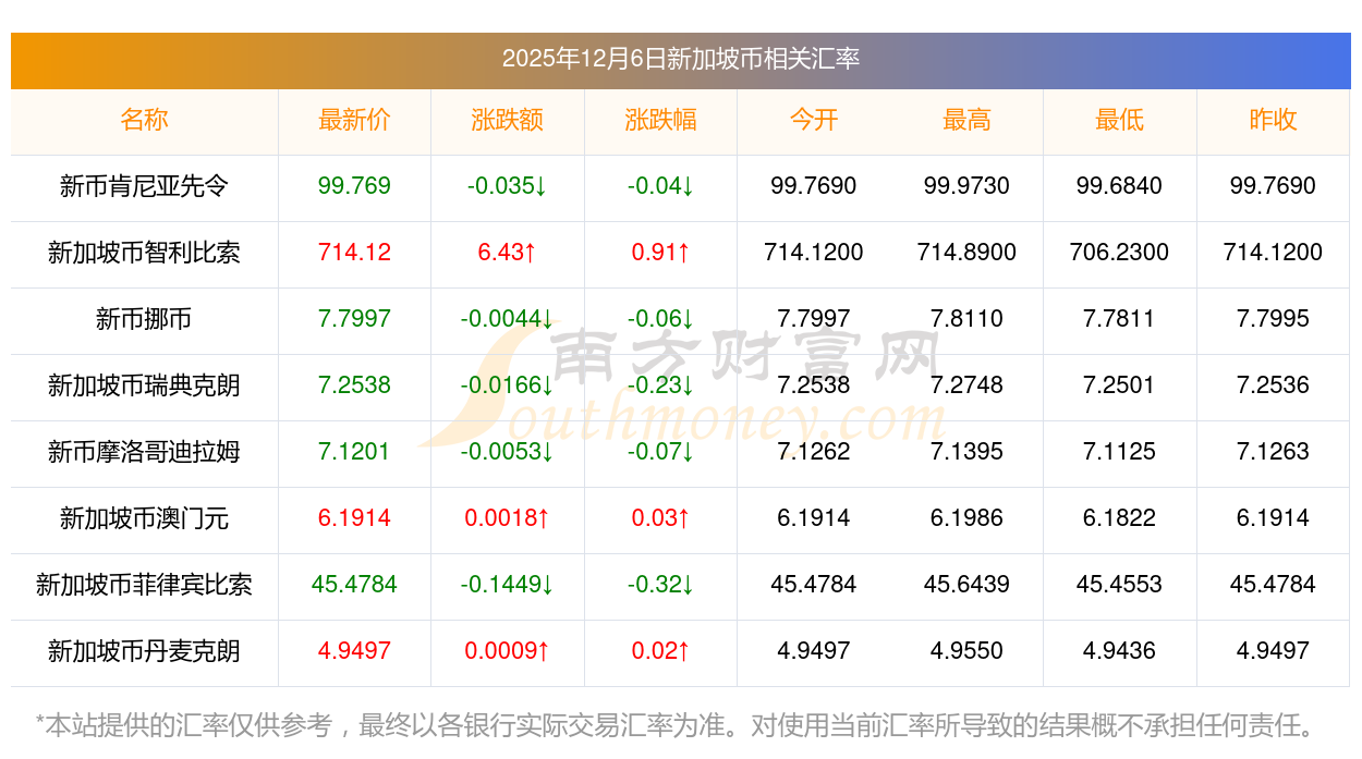 2025年12月6日新加坡幣相關(guān)匯率查詢
