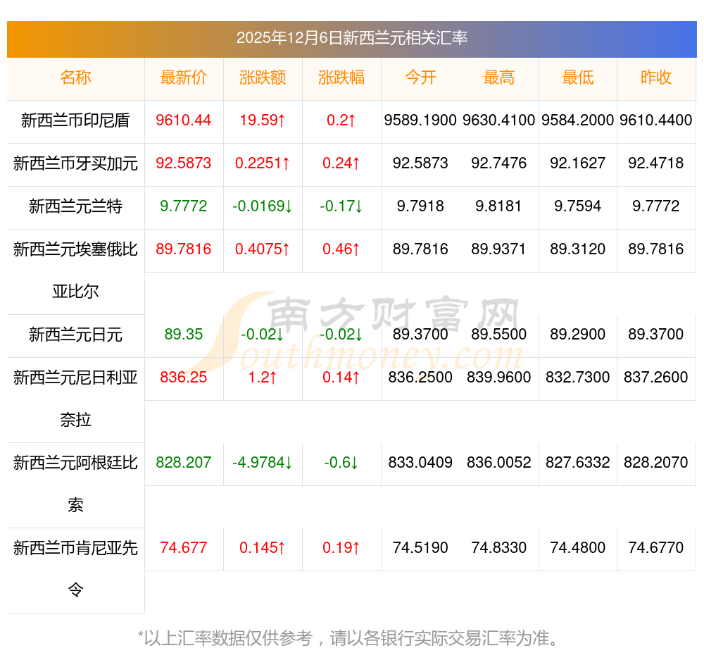 2025年12月6日新西蘭元相關(guān)匯率查詢