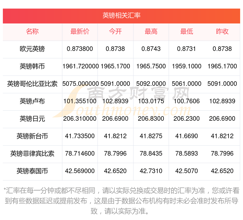 匯率在每一分鐘或都不盡相同,請(qǐng)以實(shí)際兌換或交易時(shí)的匯率為準(zhǔn),您或許看到有些數(shù)據(jù)延遲或提前發(fā)布,這是由于數(shù)據(jù)公布機(jī)構(gòu)有時(shí)未必會(huì)準(zhǔn)時(shí)發(fā)布所導(dǎo)致,請(qǐng)以實(shí)際為準(zhǔn)。