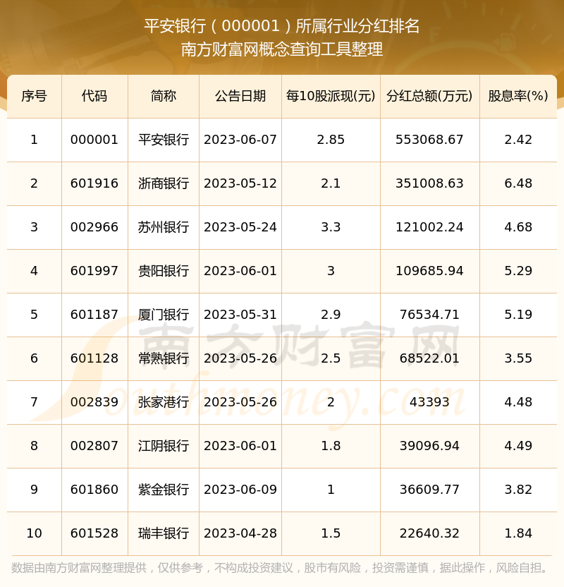 按照南方財富網(wǎng)趨勢選股系統(tǒng)統(tǒng)計,平安銀行所屬行業(yè)為銀行行業(yè),銀行行業(yè)分紅排名情況如下表: