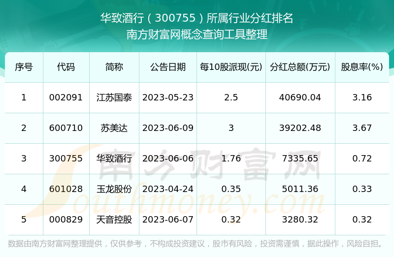 按照南方財富網(wǎng)趨勢選股系統(tǒng)統(tǒng)計,華致酒行所屬行業(yè)為白酒行業(yè),白酒行業(yè)分紅排名情況如下表: