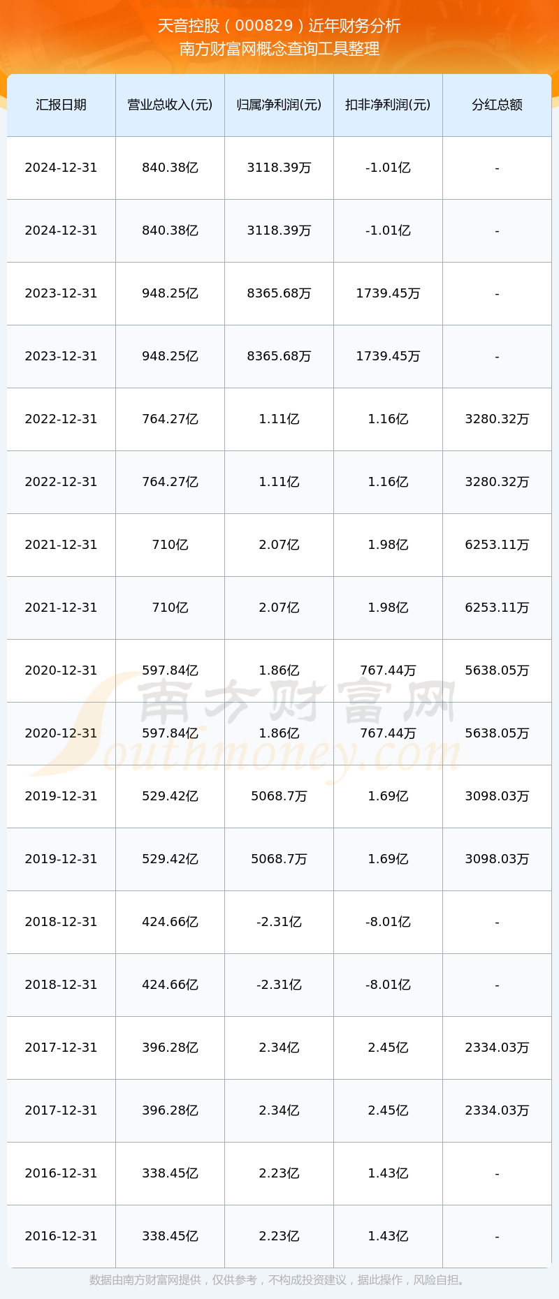 2024年天音控股總營收840.38億,同比增長-11.38%;凈利潤3118.39萬,同比增長-62.72%;銷售毛利率2.96%。
