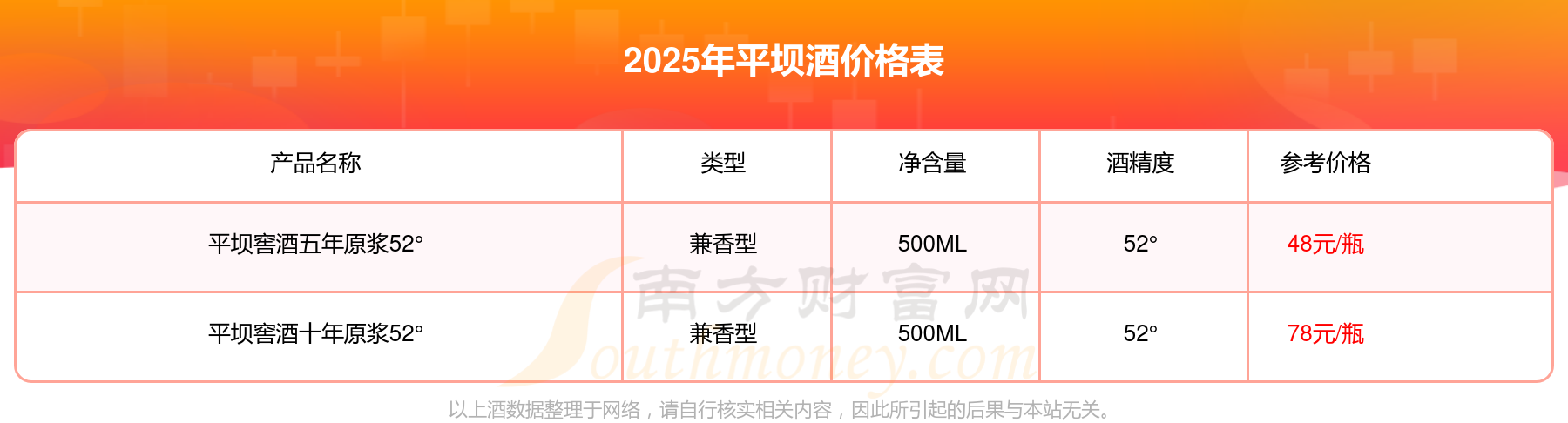 平壩窖酒十年原漿52°參考價(jià)78元/瓶、平壩窖酒五年原漿52°參考價(jià)48元/瓶。