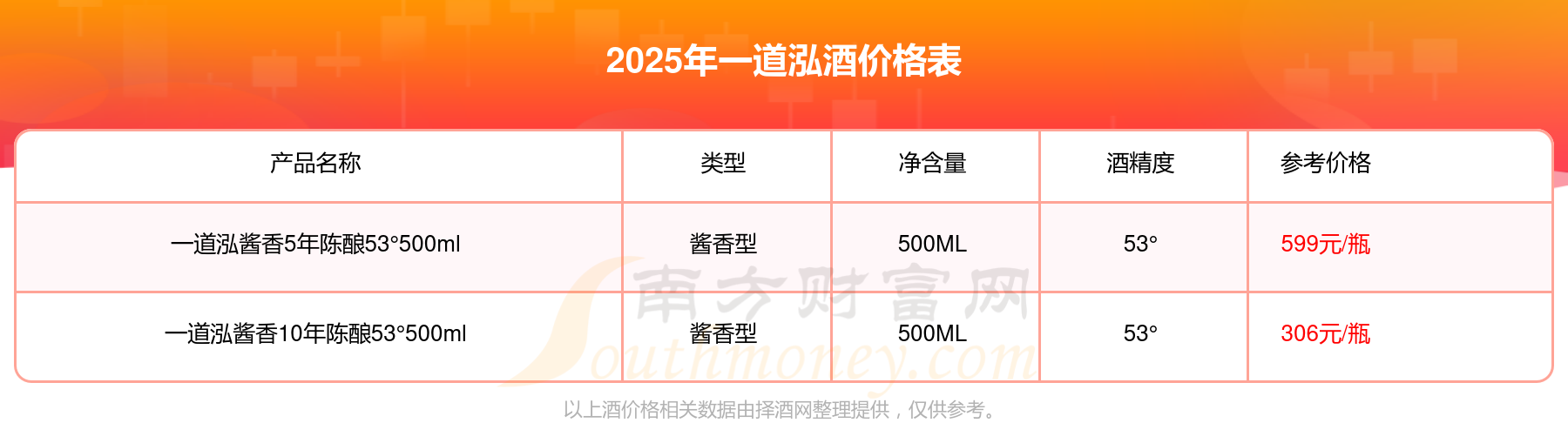 一道泓酒最新價(jià)格2025:一道泓醬香5年陳釀53°500ml參考價(jià)599元/瓶、一道泓醬香10年陳釀53°500ml參考價(jià)306元/瓶。