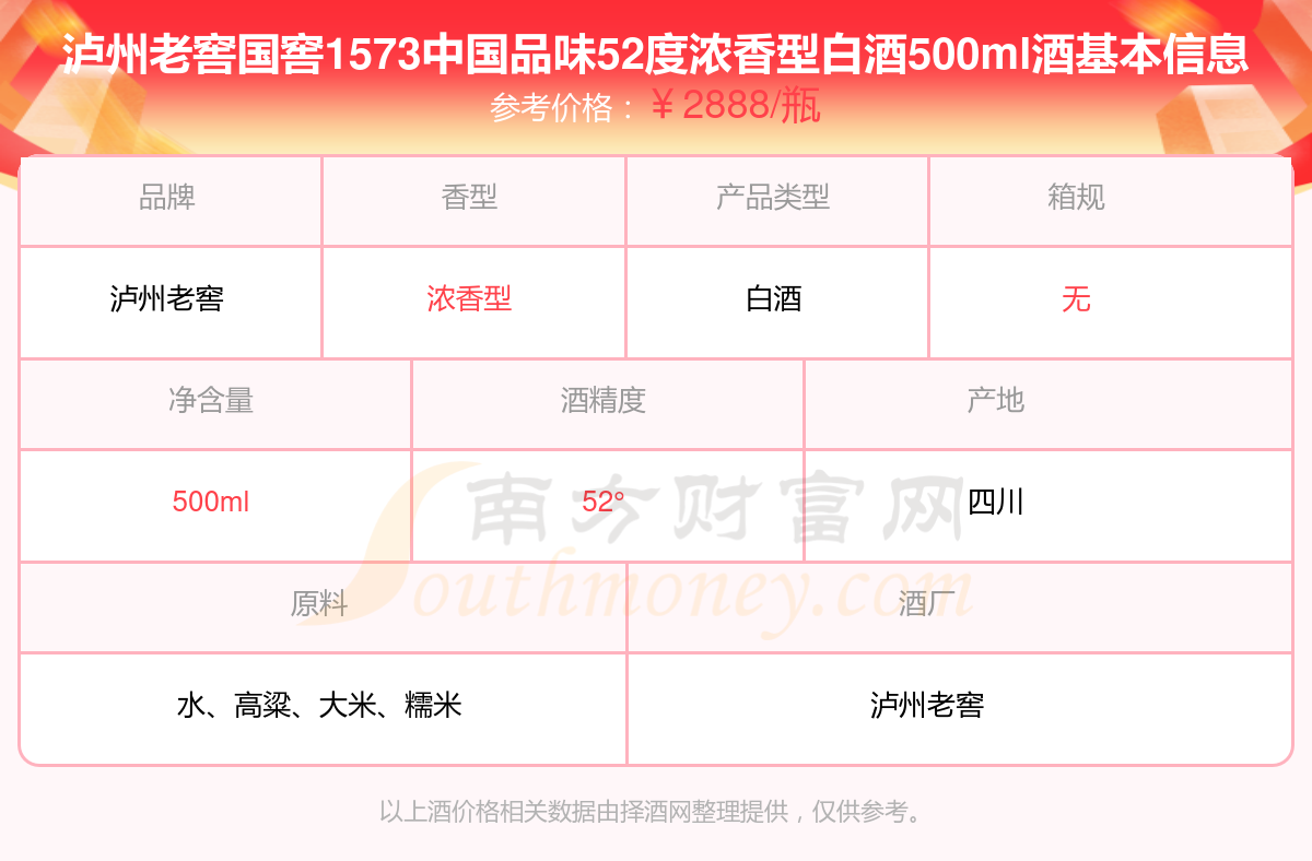 瀘州老窖國窖1573中國品味52度濃香型白酒500ml基本信息