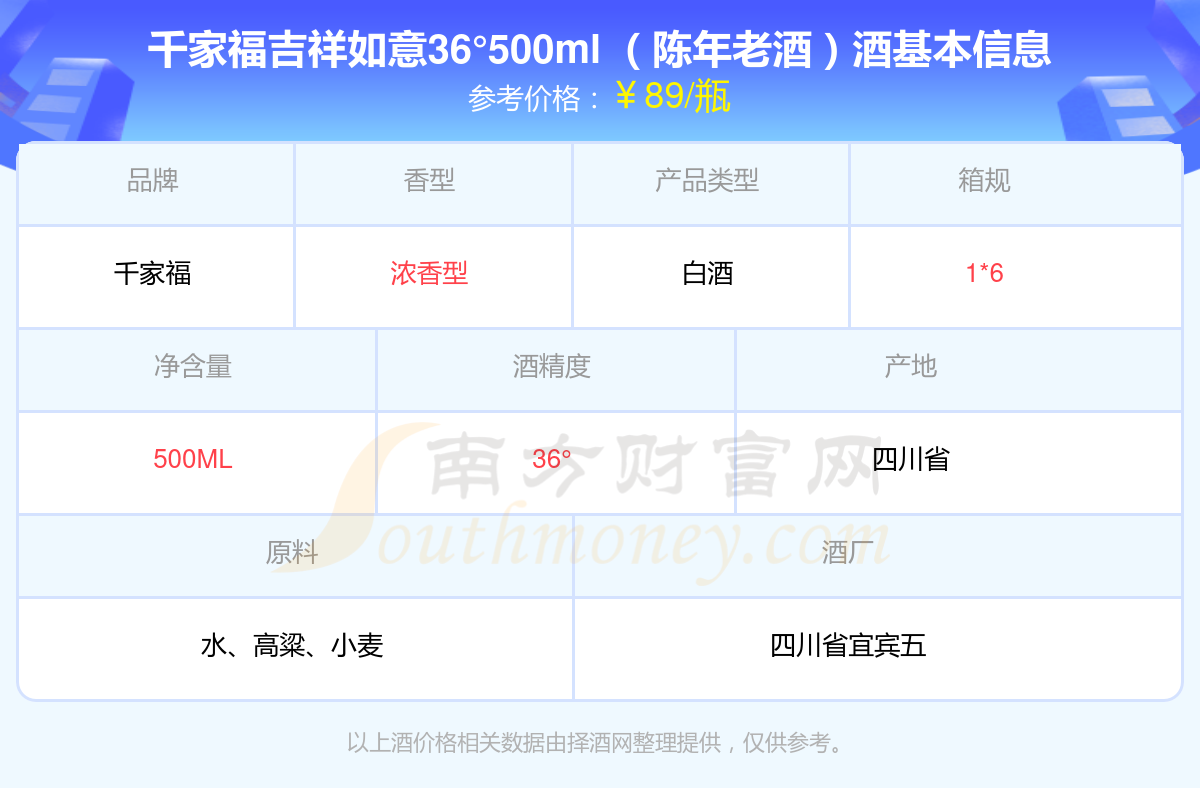 千家福酒是五糧液公司的品牌之一,之所以起名“千家!,就是為了能給千家萬戶帶來幸福。千家福酒不論是價格還是包裝都是精心策劃設(shè)計的,是一款時尚的白酒品牌。