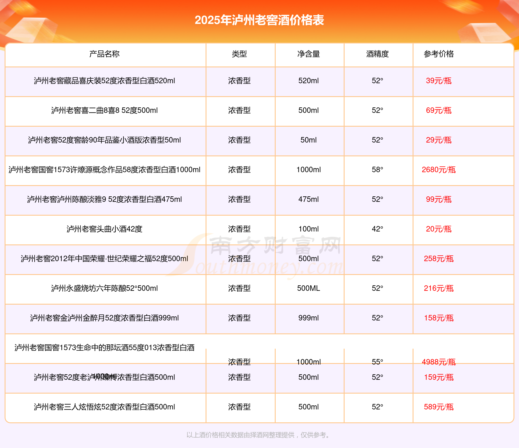 瀘州老窖酒最新價(jià)格2025:瀘州老窖國(guó)窖1573春釀鼠兆豐年E 55度參考價(jià)17999元/瓶、瀘州老窖國(guó)窖1573生命中的那壇酒55度014參考價(jià)9999元/瓶、瀘州老窖國(guó)窖1573春釀鼠兆豐年A 55度參考價(jià)5088元/瓶、瀘州老窖國(guó)窖1573生命中的那壇酒55度013濃香型白酒1000ml參考價(jià)4988元/瓶、瀘州老窖國(guó)窖1573生命中的那壇酒55度009 1000ml參考價(jià)4288元/瓶。