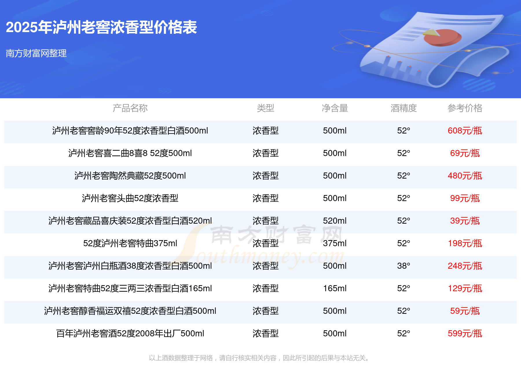 瀘州老窖濃香型酒最新價格2025:瀘州老窖國窖1573春釀鼠兆豐年E 55度參考價17999元/瓶、瀘州老窖國窖1573生命中的那壇酒55度014參考價9999元/瓶、瀘州老窖國窖1573春釀鼠兆豐年A 55度參考價5088元/瓶、瀘州老窖國窖1573生命中的那壇酒55度013濃香型白酒1000ml參考價4988元/瓶、瀘州老窖國窖1573生命中的那壇酒55度009 1000ml參考價4288元/瓶、瀘州老窖國窖1573中國品味52度濃香型白酒500ml參考價2888元/瓶。