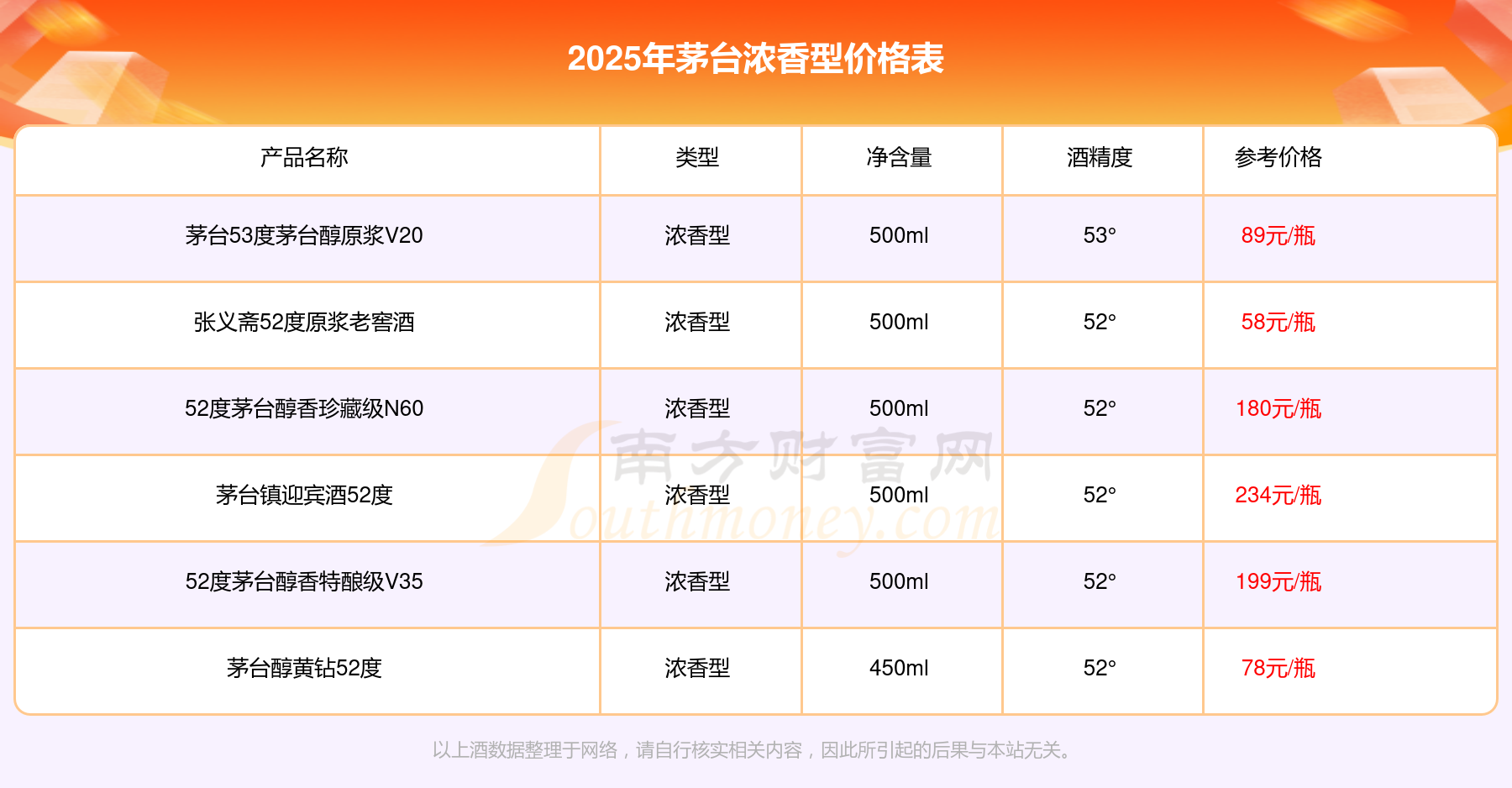 2025年,茅臺(tái)鎮(zhèn)迎賓酒52度、52度茅臺(tái)醇香特釀級(jí)V35、52度茅臺(tái)醇香珍藏級(jí)N60、茅臺(tái)53度茅臺(tái)醇原漿V20、茅臺(tái)醇黃鉆52度、張義齋52度原漿老窖酒等茅臺(tái)濃香型酒價(jià)格如下: