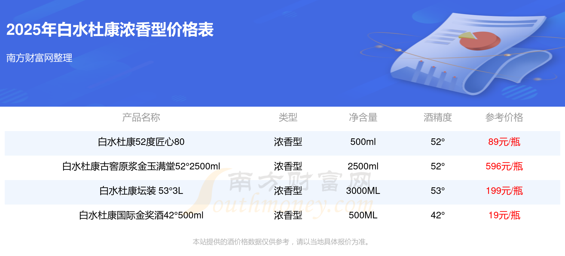 2025白水杜康濃香型酒最新價格:白水杜康古窖原漿金玉滿堂52°2500ml參考價596元/瓶、白水杜康壇裝 53°3L參考價199元/瓶、白水杜康52度匠心80參考價89元/瓶、白水杜康國際金獎酒42°500ml參考價19元/瓶。