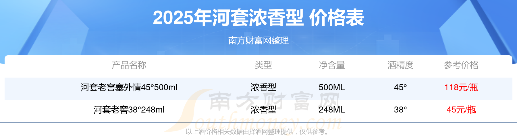 2025年,河套老窖塞外情45°500ml、河套老窖38°248ml等河套濃香型 酒價格如下: