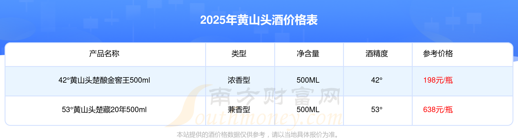 53°黃山頭楚藏20年500ml參考價638元/瓶、42°黃山頭楚釀金窖王500ml參考價198元/瓶。