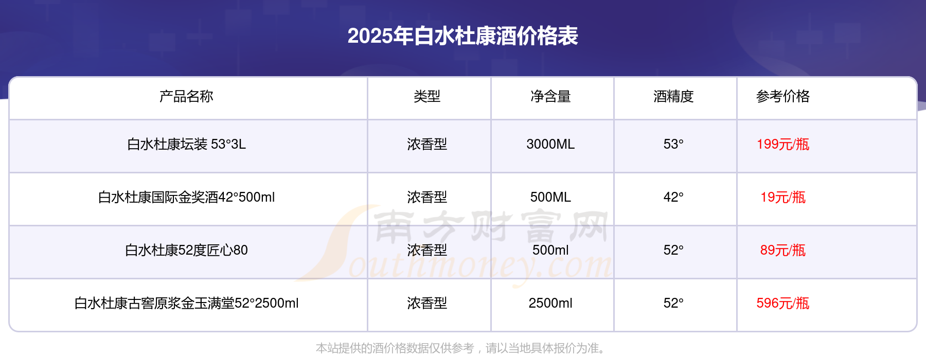 2025白水杜康酒最新價(jià)格:白水杜康古窖原漿金玉滿堂52°2500ml參考價(jià)596元/瓶、白水杜康壇裝 53°3L參考價(jià)199元/瓶、白水杜康52度匠心80參考價(jià)89元/瓶、白水杜康國際金獎(jiǎng)酒42°500ml參考價(jià)19元/瓶。
