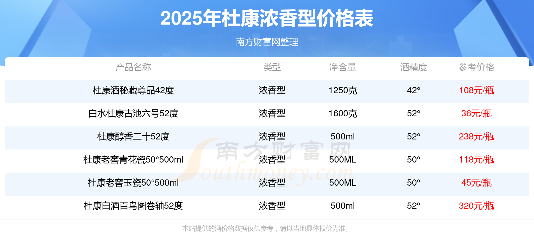 2025杜康濃香型酒最新價格:杜康白酒百鳥圖卷軸52度參考價320元/瓶、杜康醇香二十52度參考價238元/瓶、杜康老窖青花瓷50°500ml參考價118元/瓶、杜康酒秘藏尊品42度參考價108元/瓶、杜康老窖玉瓷50°500ml參考價45元/瓶、白水杜康古池六號52度參考價36元/瓶。