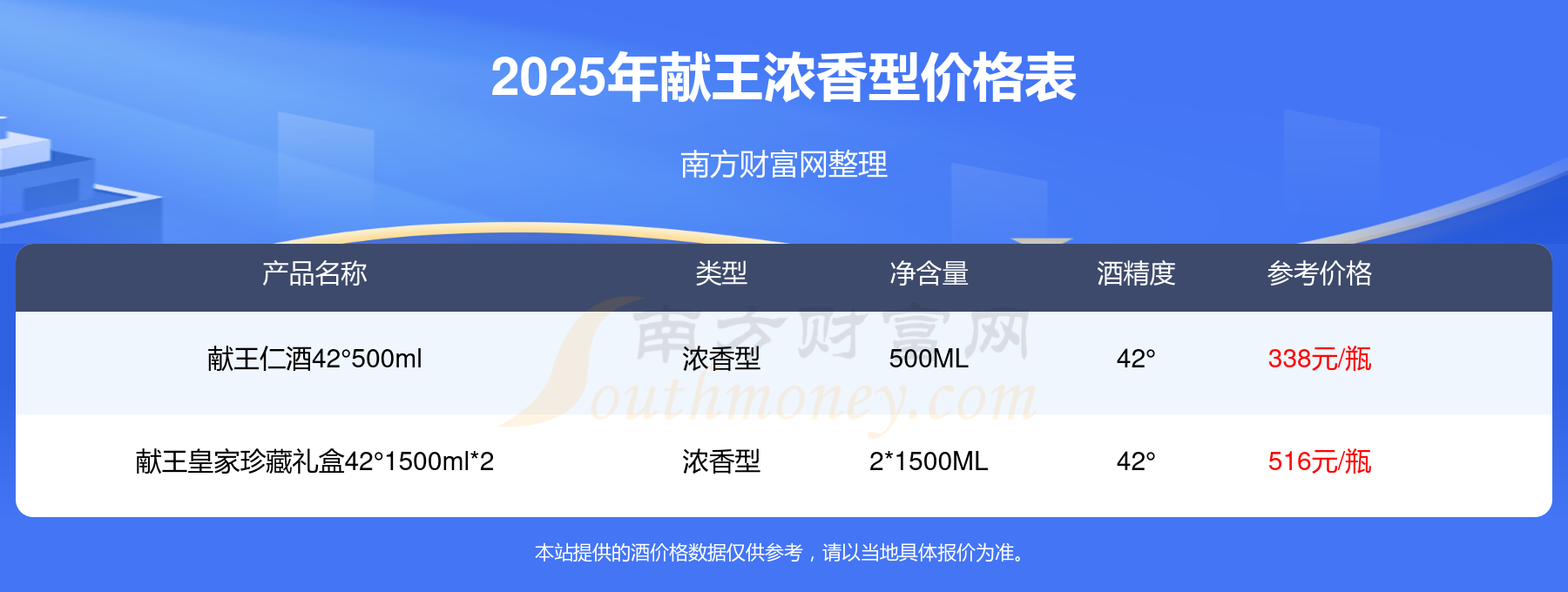 2025年,獻(xiàn)王皇家珍藏禮盒42°1500ml*2、獻(xiàn)王仁酒42°500ml等獻(xiàn)王濃香型酒價(jià)格如下: