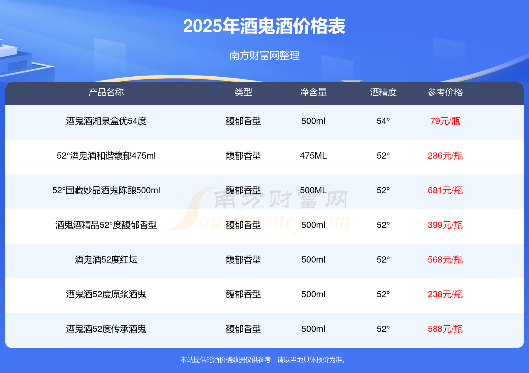 2025年,52°國藏妙品酒鬼陳釀500ml、酒鬼酒52度傳承酒鬼、酒鬼酒52度紅壇、酒鬼酒精品52°度馥郁香型、52°酒鬼酒和諧馥郁475ml等酒鬼酒價格如下:52°國藏妙品酒鬼陳釀500ml參考價681元/瓶、酒鬼酒52度傳承酒鬼參考價588元/瓶、酒鬼酒52度紅壇參考價568元/瓶、酒鬼酒精品52°度馥郁香型參考價399元/瓶、52°酒鬼酒和諧馥郁475ml參考價286元/瓶。