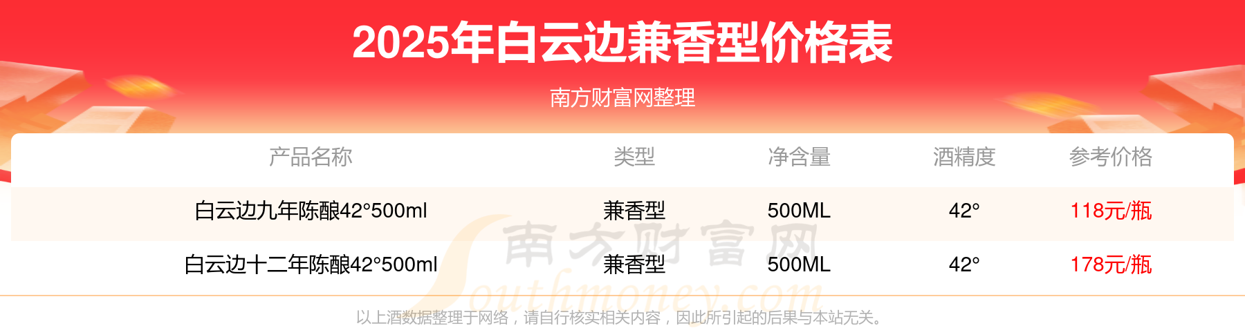 2025年,白云邊十二年陳釀42°500ml、白云邊九年陳釀42°500ml等白云邊兼香型酒價格如下:白云邊十二年陳釀42°500ml參考價178元/瓶、白云邊九年陳釀42°500ml參考價118元/瓶。
