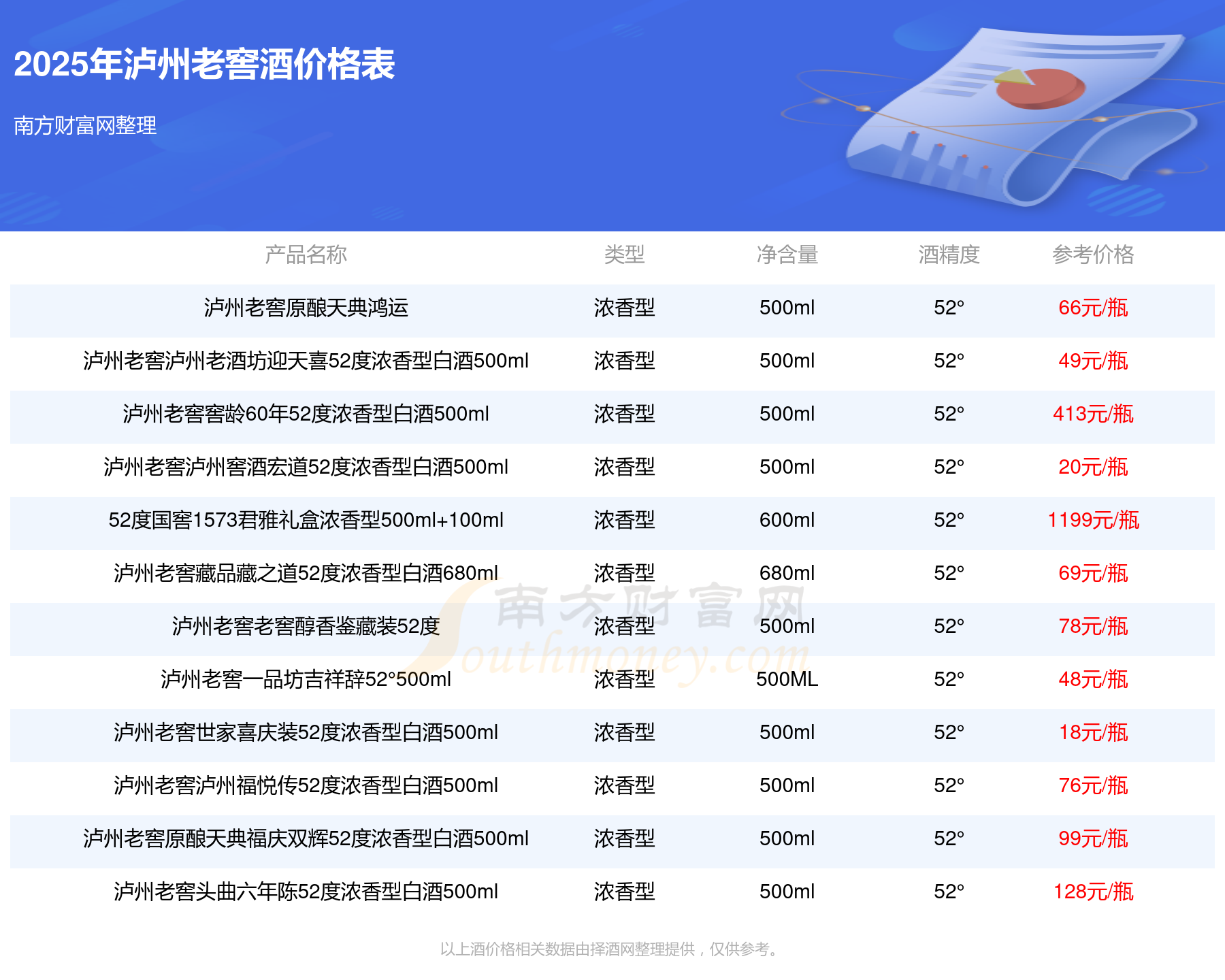2025瀘州老窖酒最新價(jià)格:瀘州老窖國窖1573春釀鼠兆豐年E 55度參考價(jià)17999元/瓶、瀘州老窖國窖1573生命中的那壇酒55度014參考價(jià)9999元/瓶、瀘州老窖國窖1573春釀鼠兆豐年A 55度參考價(jià)5088元/瓶、瀘州老窖國窖1573生命中的那壇酒55度013濃香型白酒1000ml參考價(jià)4988元/瓶、瀘州老窖國窖1573生命中的那壇酒55度009 1000ml參考價(jià)4288元/瓶、瀘州老窖國窖1573中國品味52度濃香型白酒500ml參考價(jià)2888元/瓶、瀘州老窖國窖1573許燎源概念作品58度濃香型白酒1000ml參考價(jià)2680元/瓶。