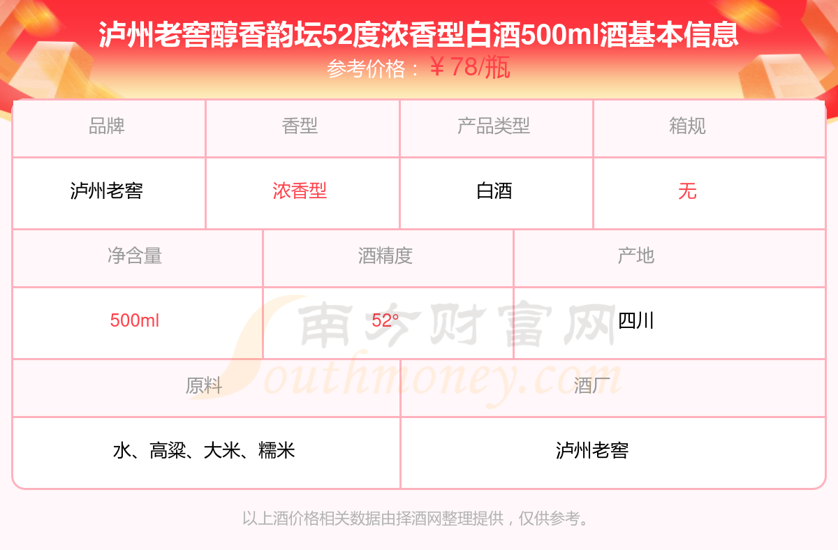 瀘州老窖醇香韻壇52度濃香型白酒500ml基本信息