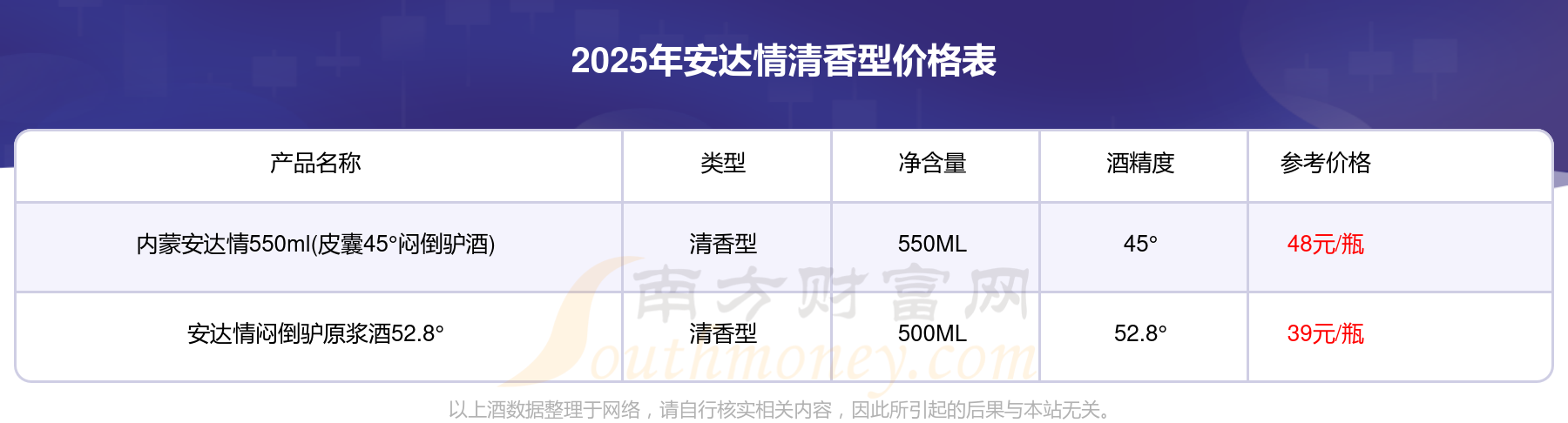 2025年,安達(dá)情清香型酒價(jià)格最高的是內(nèi)蒙安達(dá)情550ml(皮囊45°悶倒驢酒),參考價(jià)48元,最低的是安達(dá)情悶倒驢原漿酒52.8°,參考價(jià)39元,價(jià)格高低差為9元。