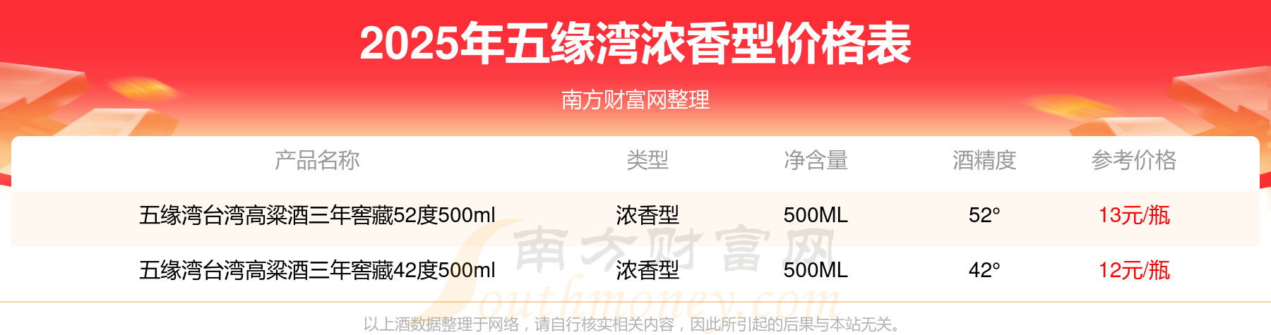 2025年五緣灣濃香型酒五緣灣臺(tái)灣高粱酒三年窖藏52度500ml、五緣灣臺(tái)灣高粱酒三年窖藏42度500ml等最新價(jià)格如下: