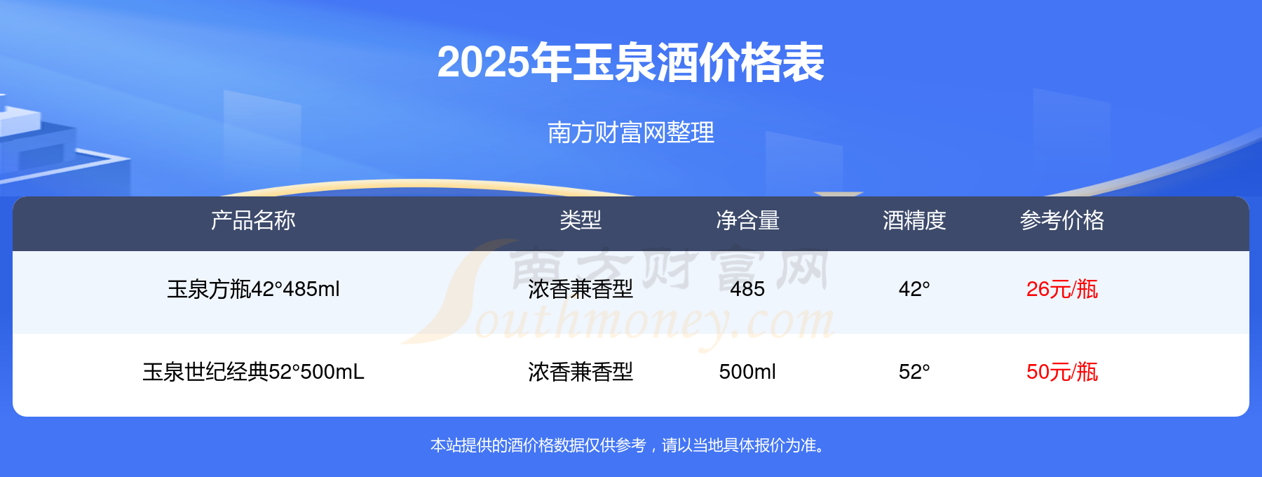 玉泉世紀(jì)經(jīng)典52°500mL參考價(jià)50元/瓶、玉泉方瓶42°485ml參考價(jià)26元/瓶。