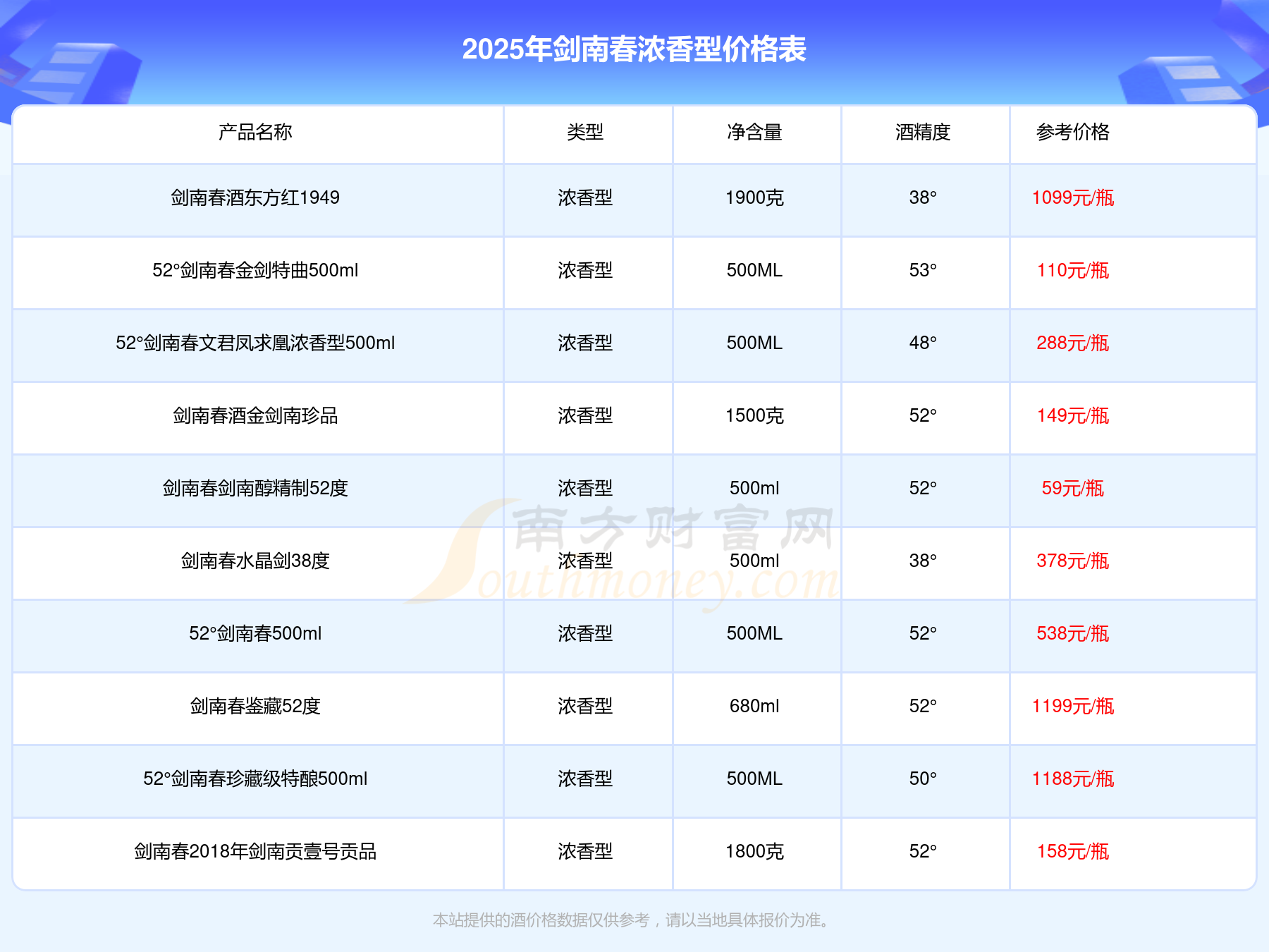 2025劍南春濃香型酒最新價格:劍南春鑒藏52度參考價1199元/瓶、52°劍南春珍藏級特釀500ml參考價1188元/瓶、劍南春酒東方紅1949參考價1099元/瓶、52°劍南春500ml參考價538元/瓶、52°劍南春水晶劍參考價489元/瓶、劍南春水晶劍38度參考價378元/瓶、52°劍南春文君鳳求凰濃香型500ml參考價288元/瓶、劍南春2018年劍南貢壹號貢品參考價158元/瓶。
