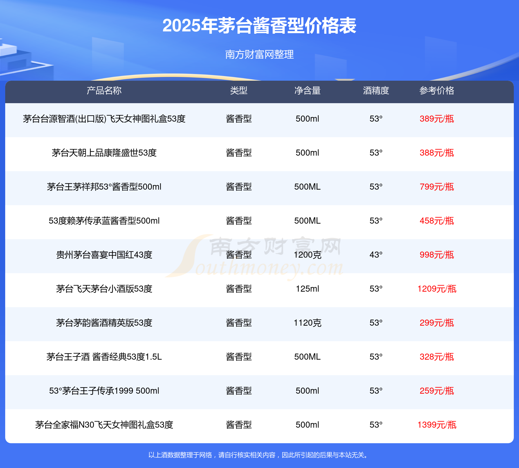 2025茅臺(tái)醬香型酒最新價(jià)格:華茅鑒藏 醬香型白酒 3L 53°參考價(jià)8388元/瓶、53度五星茅臺(tái)生肖酒丁酉雞年參考價(jià)2798元/瓶、貴州茅臺(tái)己亥豬年生肖酒53°500ml參考價(jià)2699元/瓶、53度五星茅臺(tái)生肖酒戊戌狗年參考價(jià)2698元/瓶、飛天茅臺(tái)53°500ml(2015年)參考價(jià)2199元/瓶、茅臺(tái)王子酒己亥豬年生肖紀(jì)念酒53度2.5L參考價(jià)2099元/瓶。