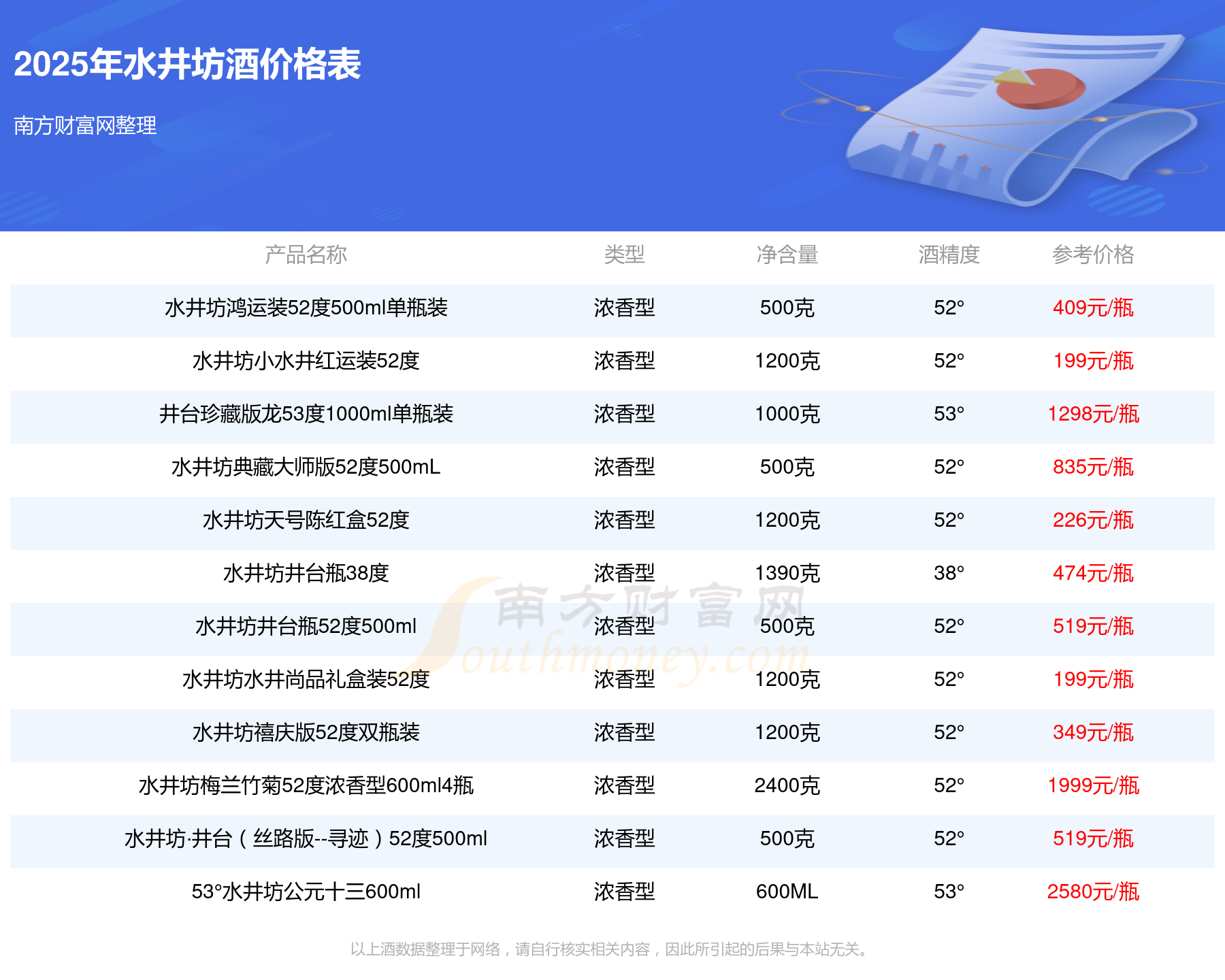 2025年,水井坊大壇收藏級(jí)原漿天球瓶66度、水井坊博物館壹號(hào)53度雙瓶裝、53°水井坊公元十三600ml、水井坊梅蘭竹菊52度濃香型600ml4瓶、水井坊菁翠52度500ml、井臺(tái)珍藏版龍53度1000ml單瓶裝、井臺(tái)珍藏版鳳53度1000ml單瓶裝、53°水晶水井坊500ml等水井坊酒價(jià)格如下:水井坊大壇收藏級(jí)原漿天球瓶66度參考價(jià)13999元/瓶、水井坊博物館壹號(hào)53度雙瓶裝參考價(jià)10988元/瓶、53°水井坊公元十三600ml參考價(jià)2580元/瓶、水井坊梅蘭竹菊52度濃香型600ml4瓶參考價(jià)1999元/瓶、水井坊菁翠52度500ml參考價(jià)1650元/瓶、井臺(tái)珍藏版龍53度1000ml單瓶裝參考價(jià)1298元/瓶、井臺(tái)珍藏版鳳53度1000ml單瓶裝參考價(jià)1298元/瓶、53°水晶水井坊500ml參考價(jià)898元/瓶。