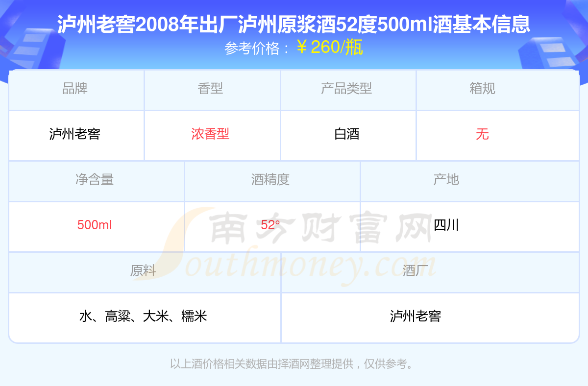 瀘州老窖2008年出廠瀘州原漿酒52度500ml基本信息