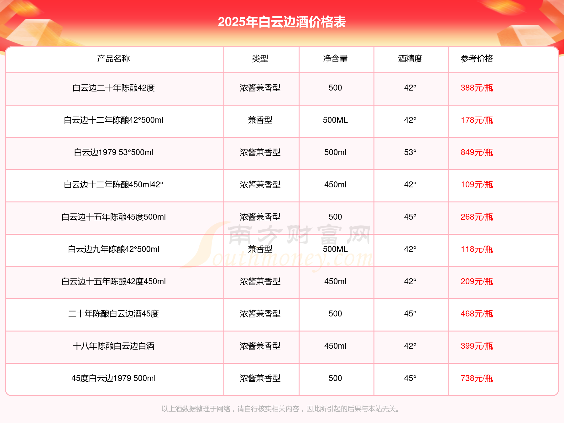 白云邊酒最新價(jià)格2025:白云邊1979 53°500ml參考價(jià)849元/瓶、45度白云邊1979 500ml參考價(jià)738元/瓶、二十年陳釀白云邊酒45度參考價(jià)468元/瓶、十八年陳釀白云邊白酒參考價(jià)399元/瓶、白云邊二十年陳釀42度參考價(jià)388元/瓶、白云邊十五年陳釀45度500ml參考價(jià)268元/瓶、白云邊十五年陳釀42度450ml參考價(jià)209元/瓶。