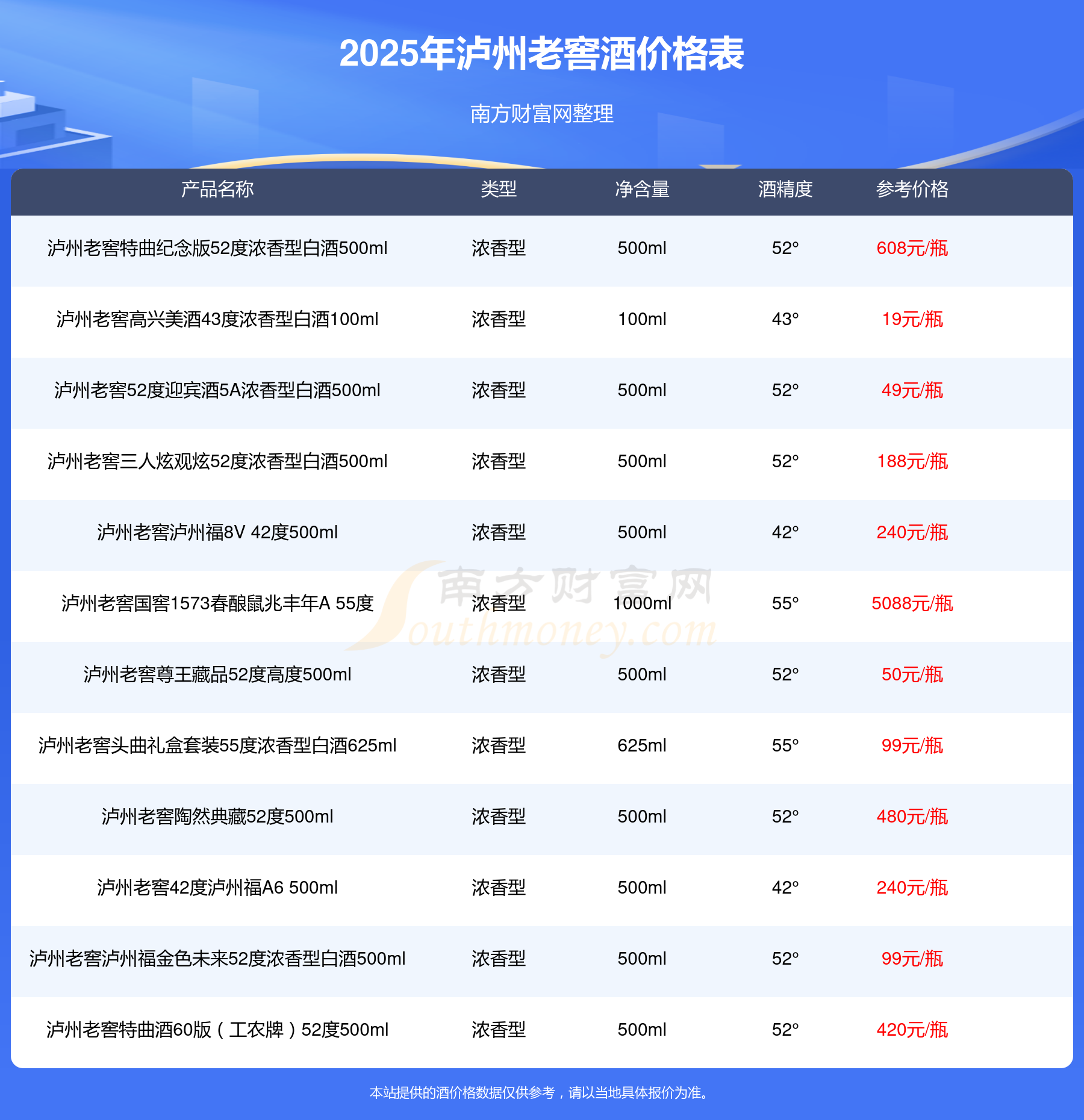 2025瀘州老窖酒最新價格:瀘州老窖國窖1573春釀鼠兆豐年E 55度參考價17999元/瓶、瀘州老窖國窖1573生命中的那壇酒55度014參考價9999元/瓶、瀘州老窖國窖1573春釀鼠兆豐年A 55度參考價5088元/瓶、瀘州老窖國窖1573生命中的那壇酒55度013濃香型白酒1000ml參考價4988元/瓶。