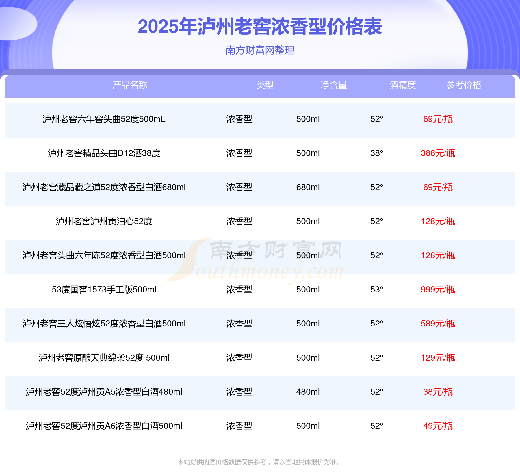 瀘州老窖濃香型酒最新價(jià)格2025:瀘州老窖國(guó)窖1573春釀鼠兆豐年E 55度參考價(jià)17999元/瓶、瀘州老窖國(guó)窖1573生命中的那壇酒55度014參考價(jià)9999元/瓶、瀘州老窖國(guó)窖1573春釀鼠兆豐年A 55度參考價(jià)5088元/瓶、瀘州老窖國(guó)窖1573生命中的那壇酒55度013濃香型白酒1000ml參考價(jià)4988元/瓶、瀘州老窖國(guó)窖1573生命中的那壇酒55度009 1000ml參考價(jià)4288元/瓶。