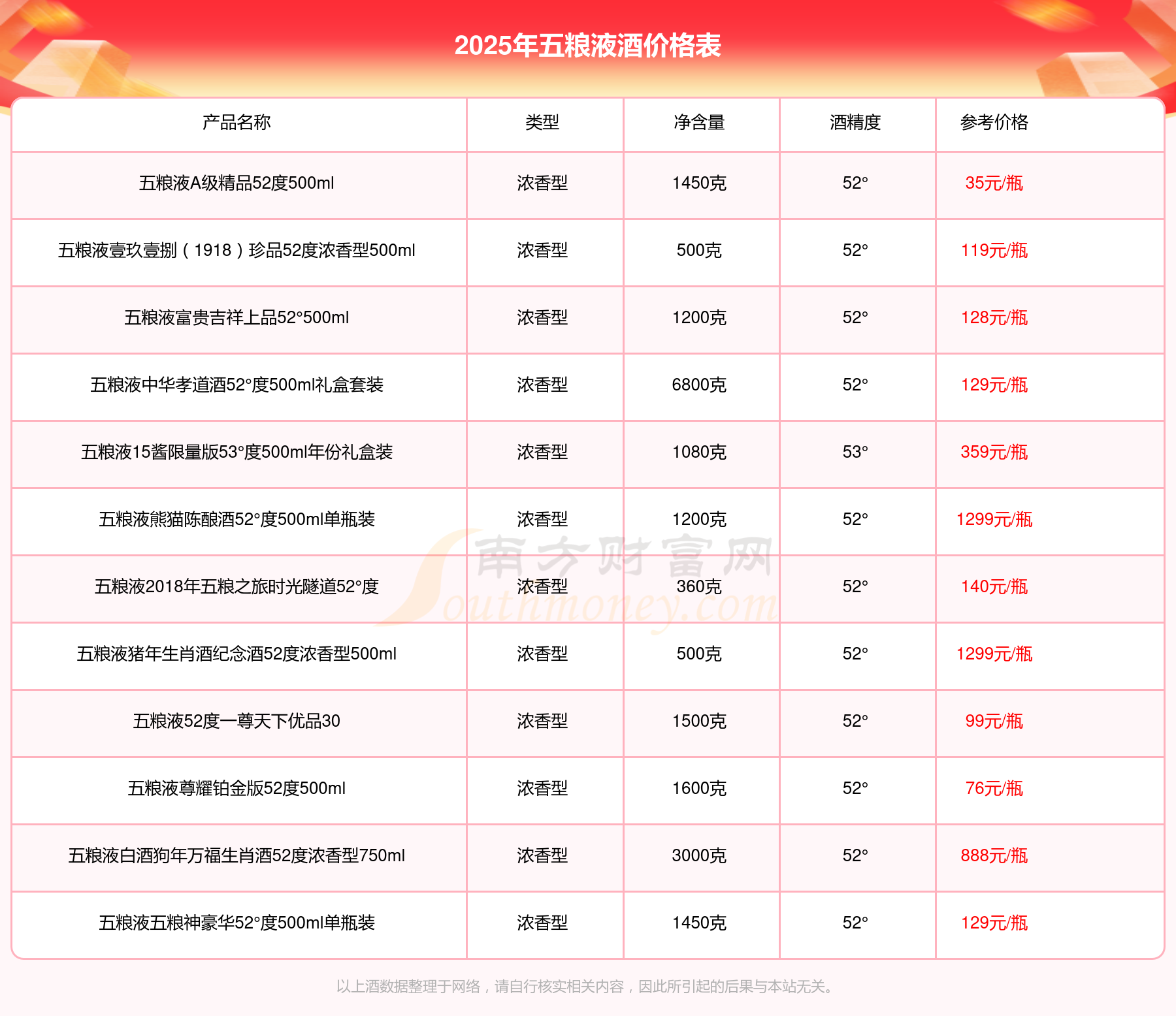 當(dāng)前五糧液酒價(jià)格最高的酒為五糧液百年世博世紀(jì)榮耀紀(jì)念酒60°999ml,參考價(jià)26980元/瓶,而五糧液酒價(jià)格最低的是五糧液干一杯小瓶46度,參考價(jià)16元/瓶,價(jià)格高低差為26964元/瓶。