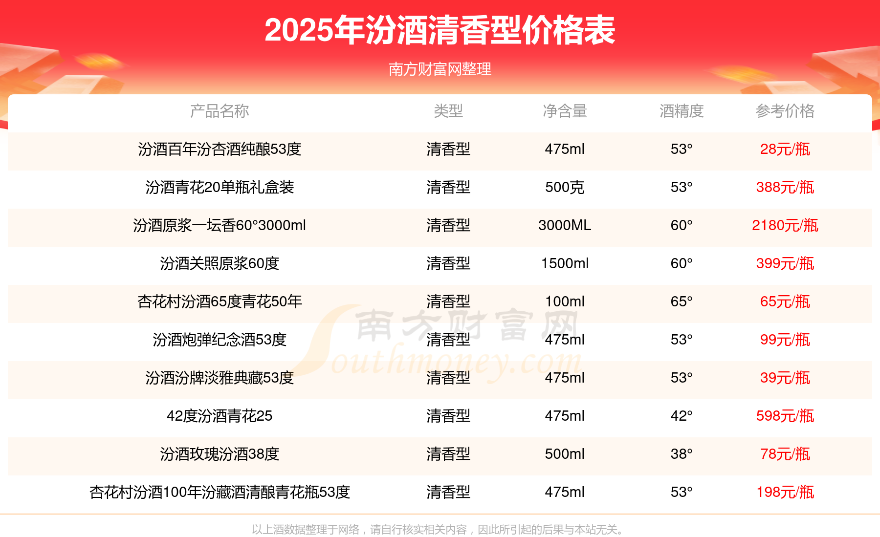 2025年,汾酒原漿一壇香60°3000ml、汾酒原漿一壇香60°1500ml、42度汾酒青花25、汾酒收藏系列盤古汾酒55度、汾酒關(guān)照原漿60度、汾酒青花20單瓶禮盒裝、汾酒海峽情42度等汾酒清香型酒價(jià)格如下:汾酒原漿一壇香60°3000ml參考價(jià)2180元/瓶、汾酒原漿一壇香60°1500ml參考價(jià)1536元/瓶、42度汾酒青花25參考價(jià)598元/瓶、汾酒收藏系列盤古汾酒55度參考價(jià)400元/瓶、汾酒關(guān)照原漿60度參考價(jià)399元/瓶、汾酒青花20單瓶禮盒裝參考價(jià)388元/瓶、汾酒海峽情42度參考價(jià)218元/瓶。