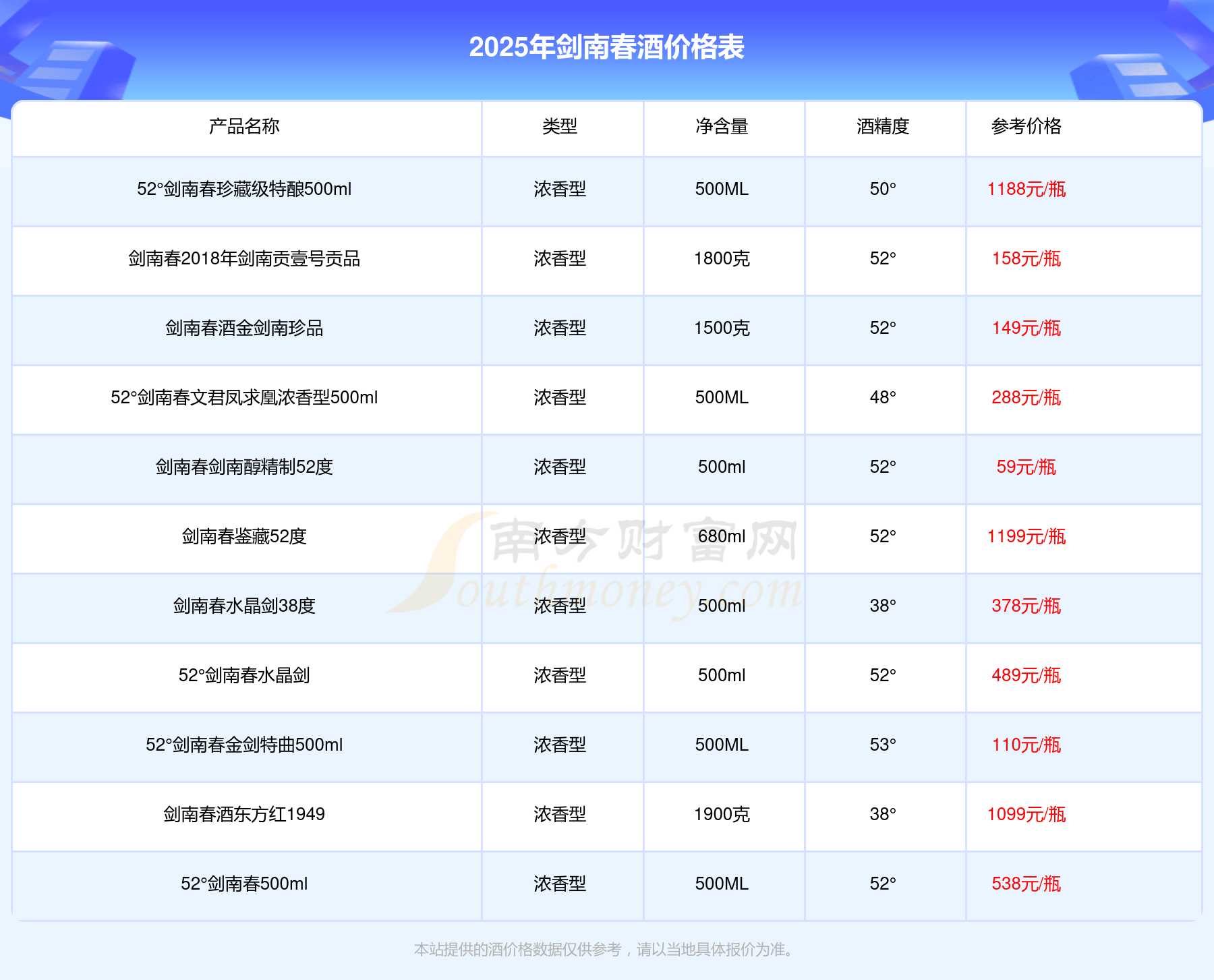 2025年,劍南春鑒藏52度、52°劍南春珍藏級(jí)特釀500ml、劍南春酒東方紅1949、52°劍南春500ml、52°劍南春水晶劍、劍南春水晶劍38度、52°劍南春文君鳳求凰濃香型500ml等劍南春酒參考價(jià)格如下:劍南春鑒藏52度參考價(jià)1199元、52°劍南春珍藏級(jí)特釀500ml參考價(jià)1188元、劍南春酒東方紅1949參考價(jià)1099元、52°劍南春500ml參考價(jià)538元、52°劍南春水晶劍參考價(jià)489元、劍南春水晶劍38度參考價(jià)378元、52°劍南春文君鳳求凰濃香型500ml參考價(jià)288元。