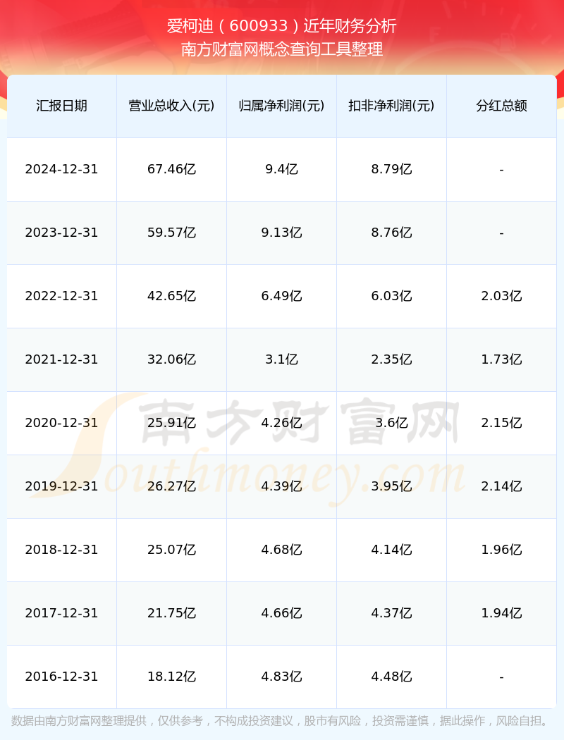 愛柯迪公司2024年實現(xiàn)營業(yè)收入67.46億元,同比增長13.24%;凈利潤9.4億元,同比增長2.86%;毛利率27.65%。