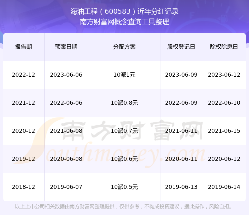 近年海油工程分紅情況如下表所示: