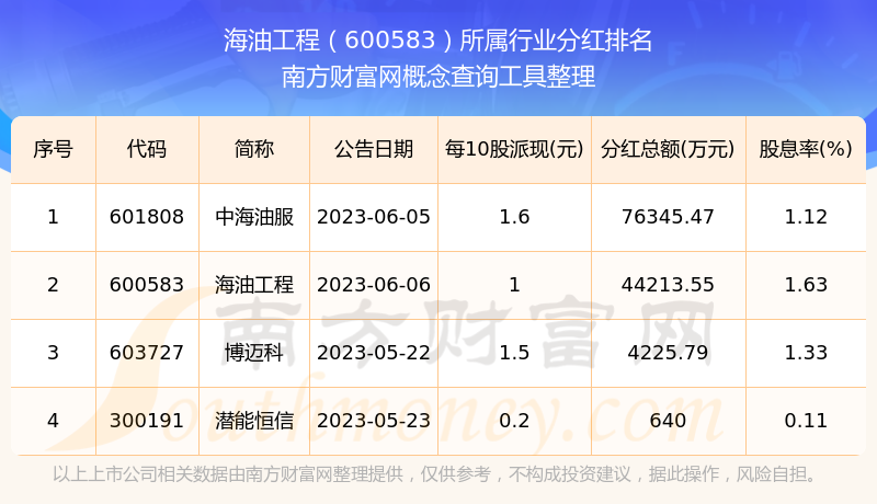 按照南方財富網(wǎng)趨勢選股系統(tǒng)統(tǒng)計,海油工程所屬行業(yè)為海工裝備行業(yè),海工裝備行業(yè)分紅排名情況如下表: