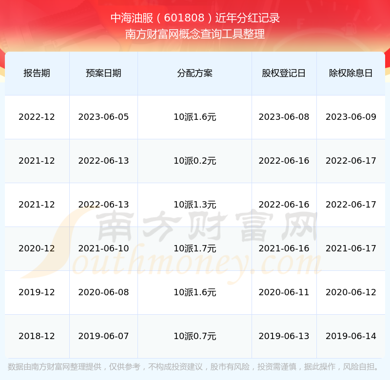 中海油服最新一次公布的分紅方案:10派1.6元。