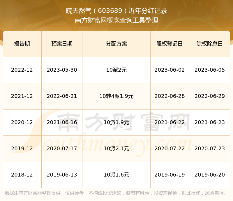 皖天然氣最新一次公布的分紅方案為10派2元。本次權(quán)益分派股權(quán)登記日為2023年6月2日,除權(quán)除息日為2023年6月5日,派息日為2023年6月5日。