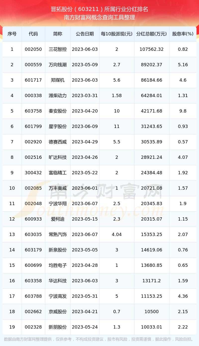 按照南方財(cái)富網(wǎng)趨勢(shì)選股系統(tǒng)統(tǒng)計(jì),晉拓股份所屬行業(yè)為汽車零部件行業(yè),汽車零部件行業(yè)分紅排名情況如下表: