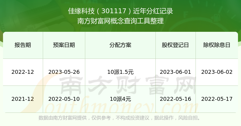佳緣科技最新一次公布的分紅方案為10派1.5元。本次權(quán)益分派股權(quán)登記日為2023年6月1日,除權(quán)除息日為2023年6月2日,派息日為2023年6月2日。