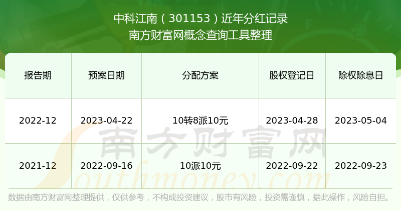 中科江南最新一次公布的分紅方案為10轉(zhuǎn)8派10元。本次權(quán)益分派股權(quán)登記日為2023年4月28日,除權(quán)除息日為2023年5月4日,派息日為2023年5月4日。