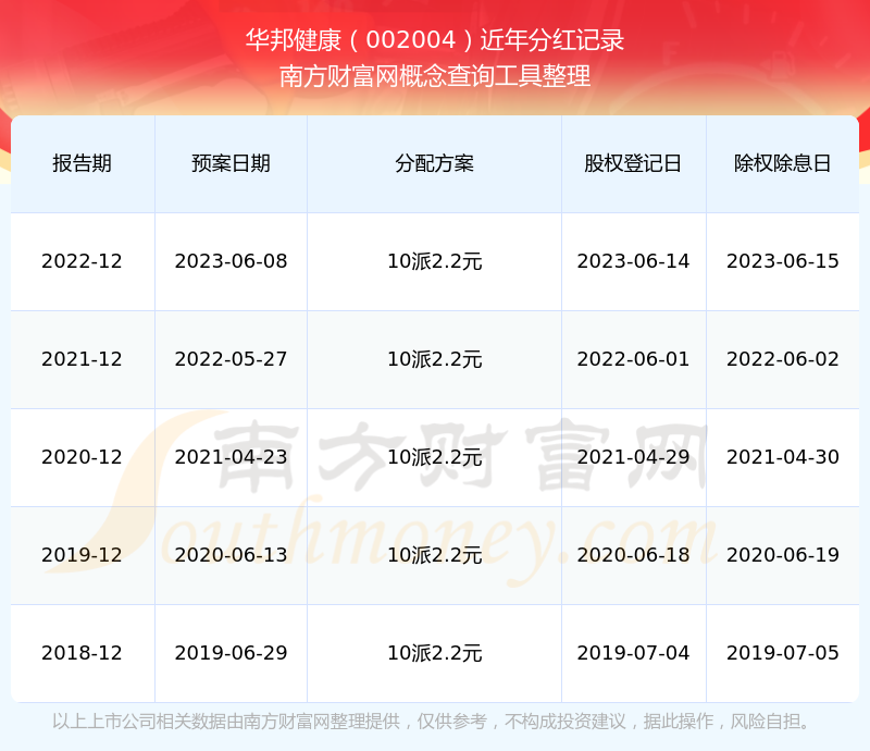 華邦健康最新一次公布的分紅方案為10派2.2元。本次權(quán)益分派股權(quán)登記日為2023年6月14日,除權(quán)除息日為2023年6月15日,派息日為2023年6月15日。