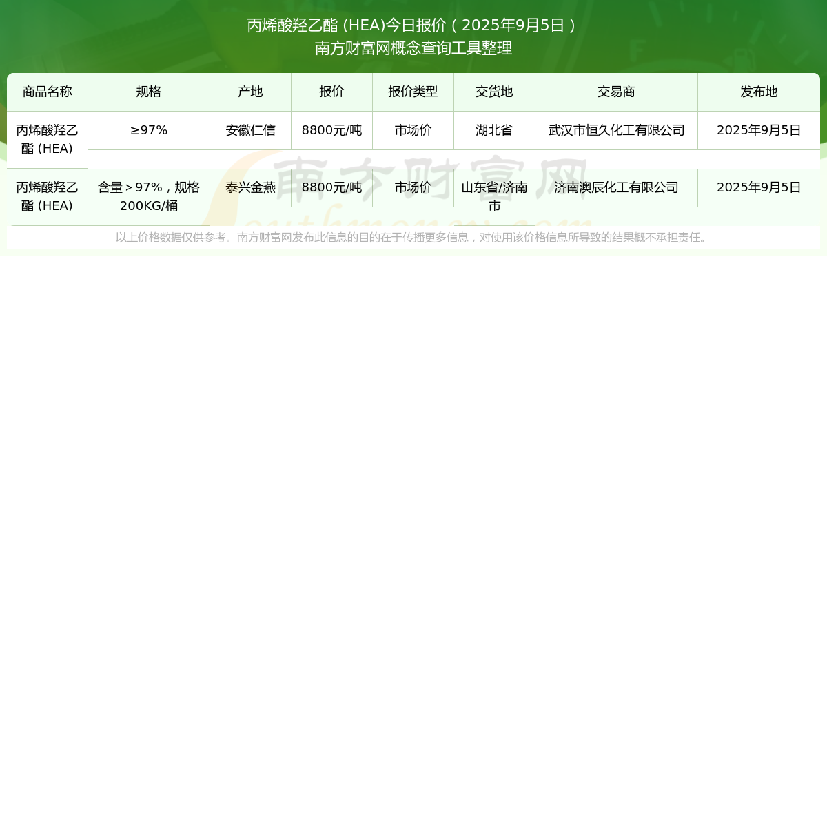 2025年9月5日,丙烯酸羥乙酯 (HEA)(含量>97%,規(guī)格200KG/桶)市場價價格為8800.00元/噸,報價人:濟南澳辰化工有限公司,交易地點為山東省/濟南市。