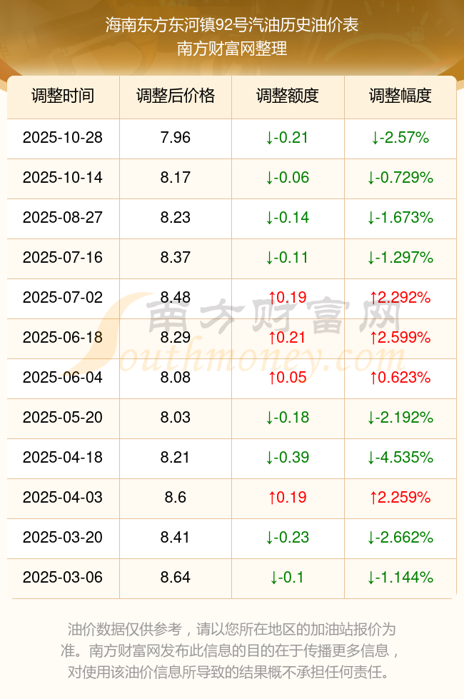 11月2日海南東方東河鎮(zhèn)92號汽油歷史油價調(diào)整一覽表